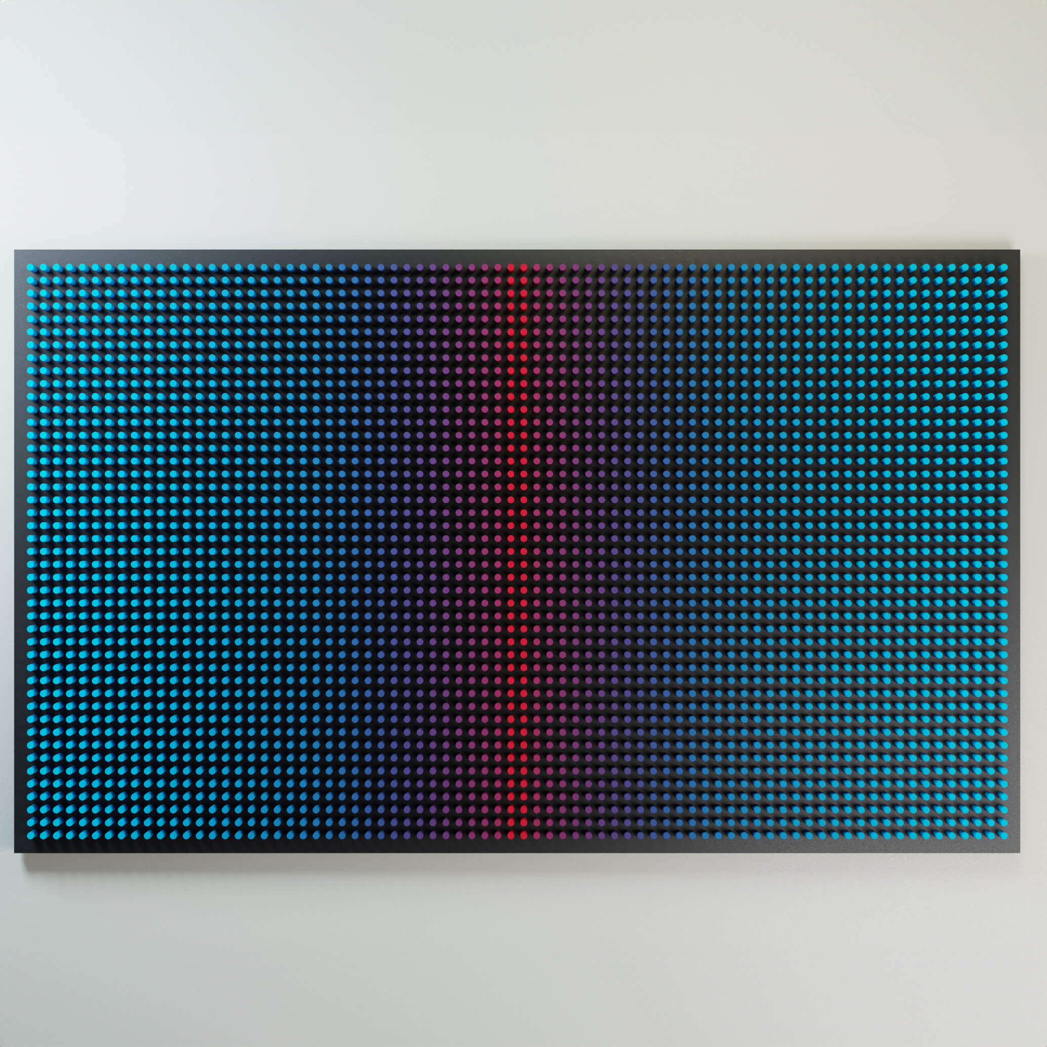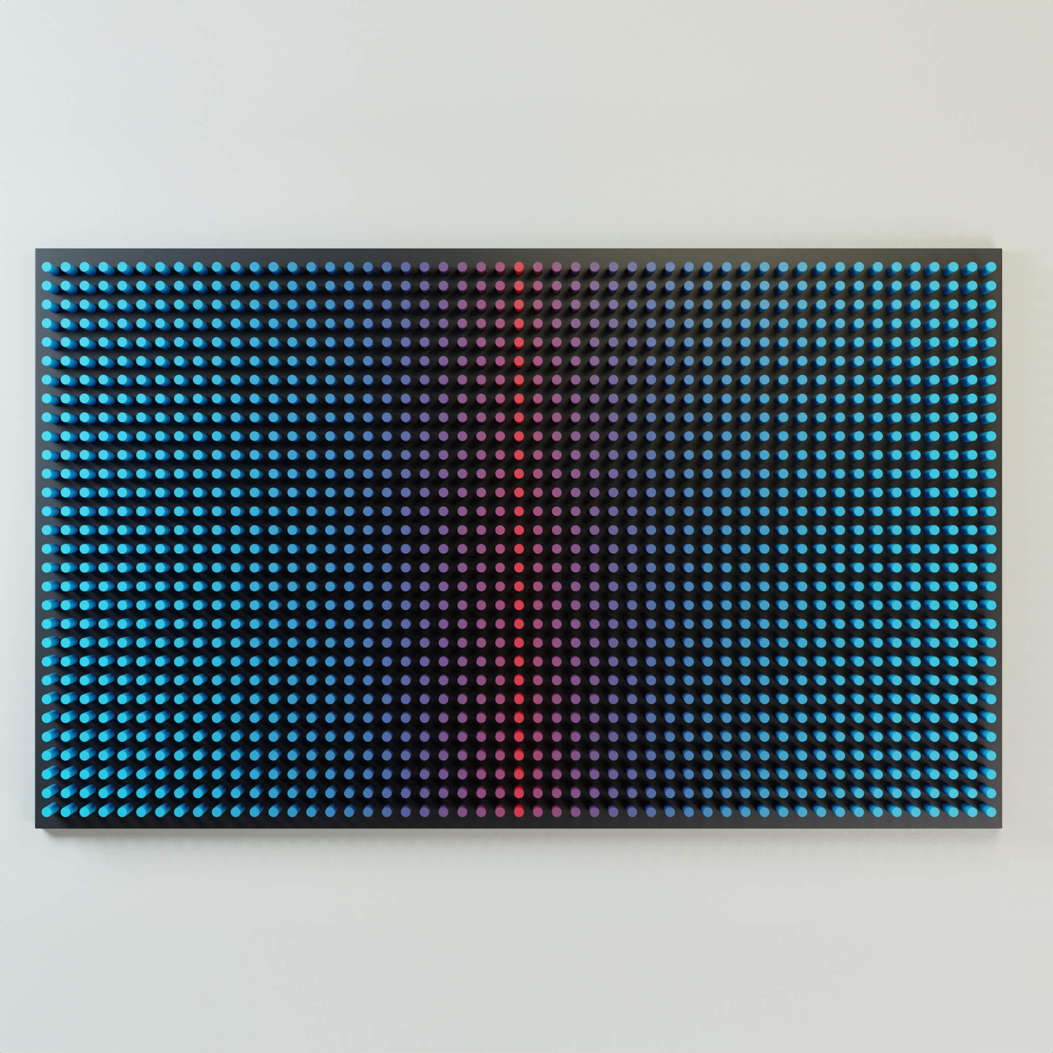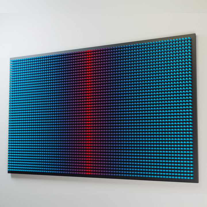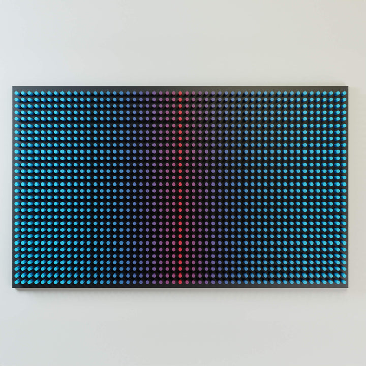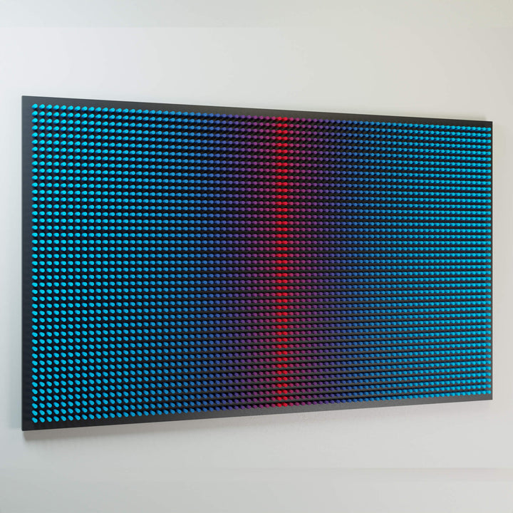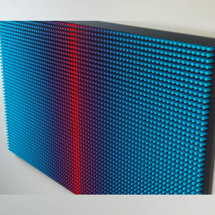 "Cold Screen on the black" is part of the Screens series, where layered wooden structures resemble abstract interfaces — windows into shifting emotional and perceptual states. The work explores how color, rhythm, and geometric segmentation can create the feeling of looking through a digital screen into a deeper, quieter inner landscape.