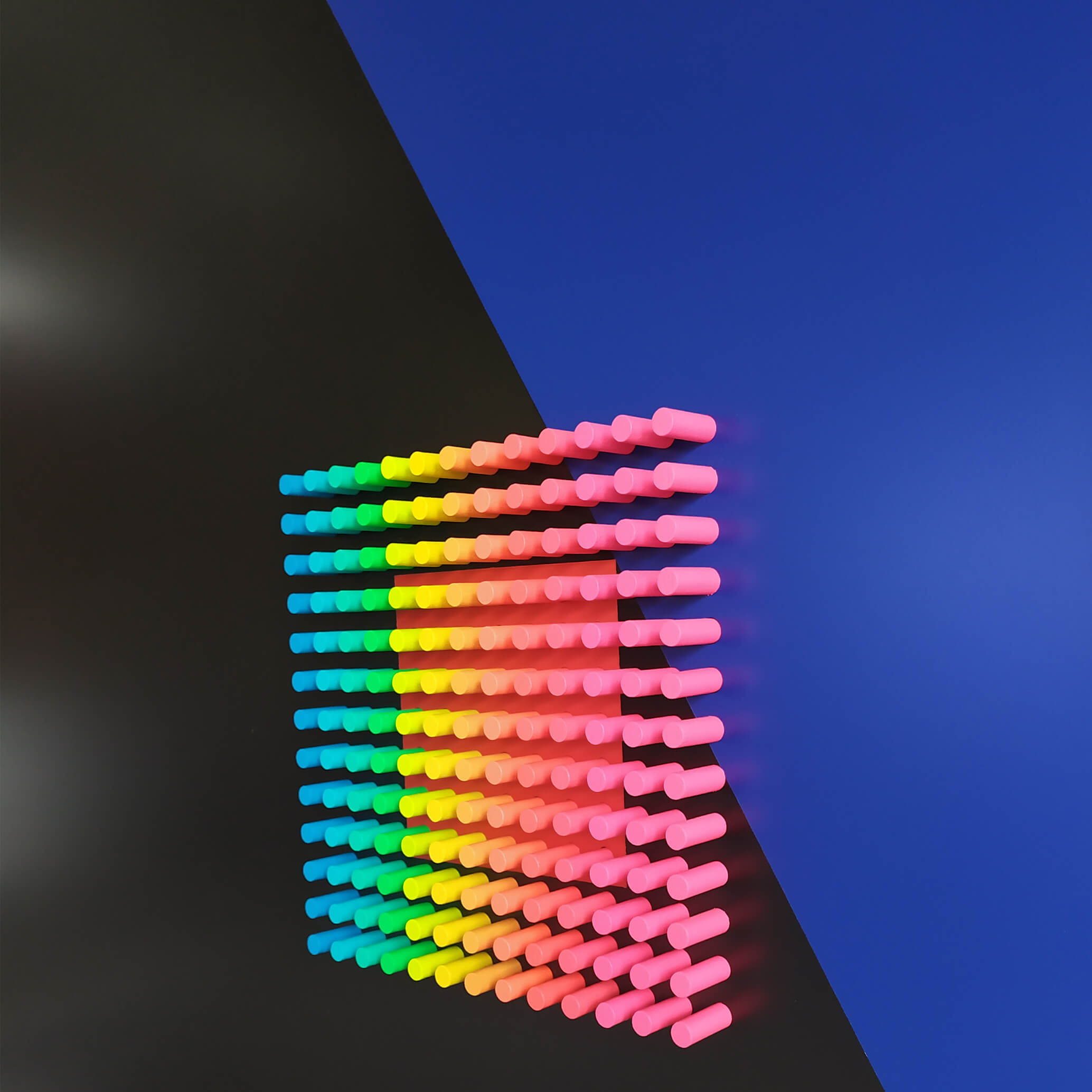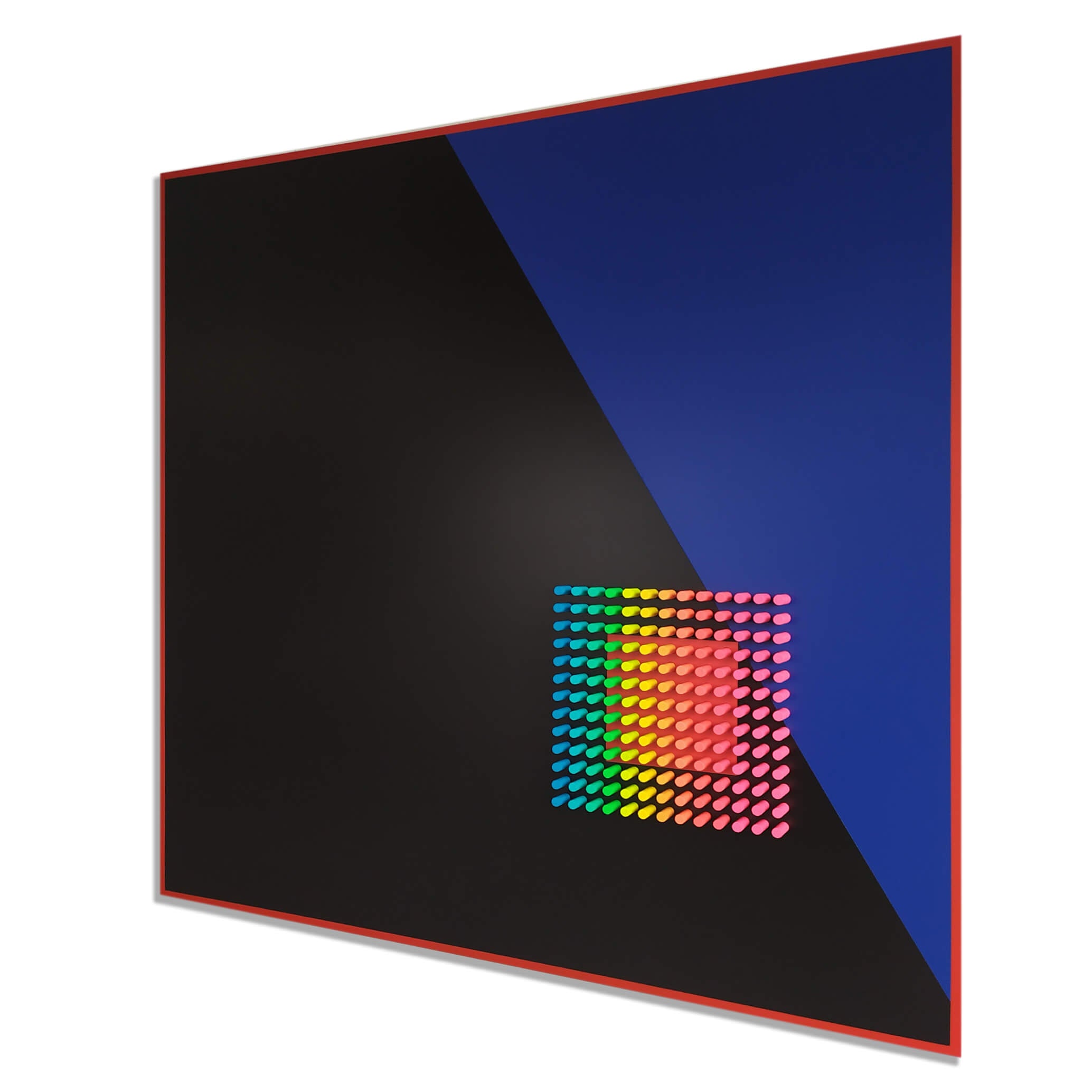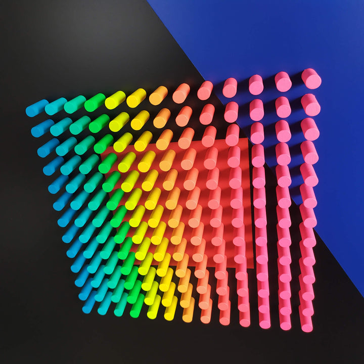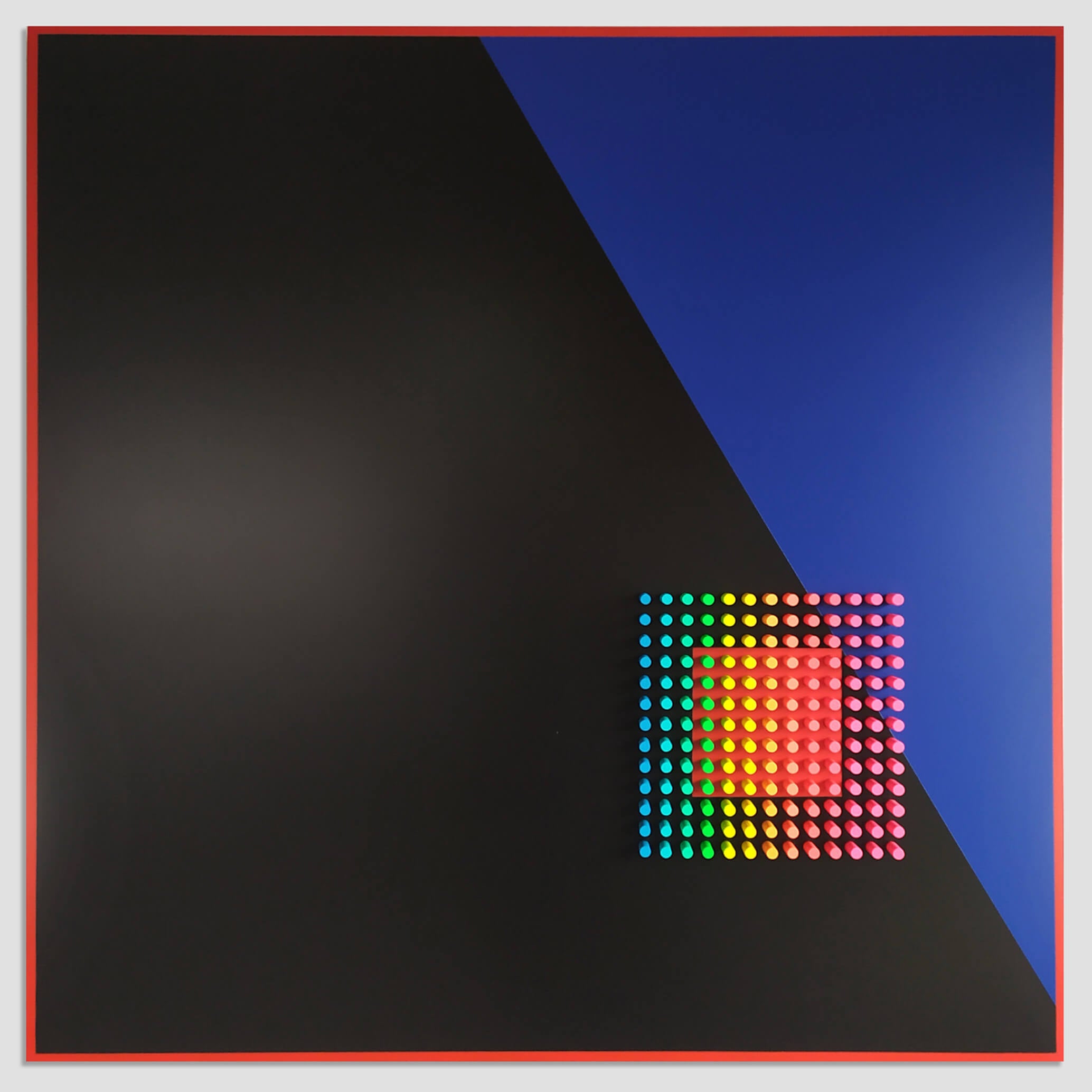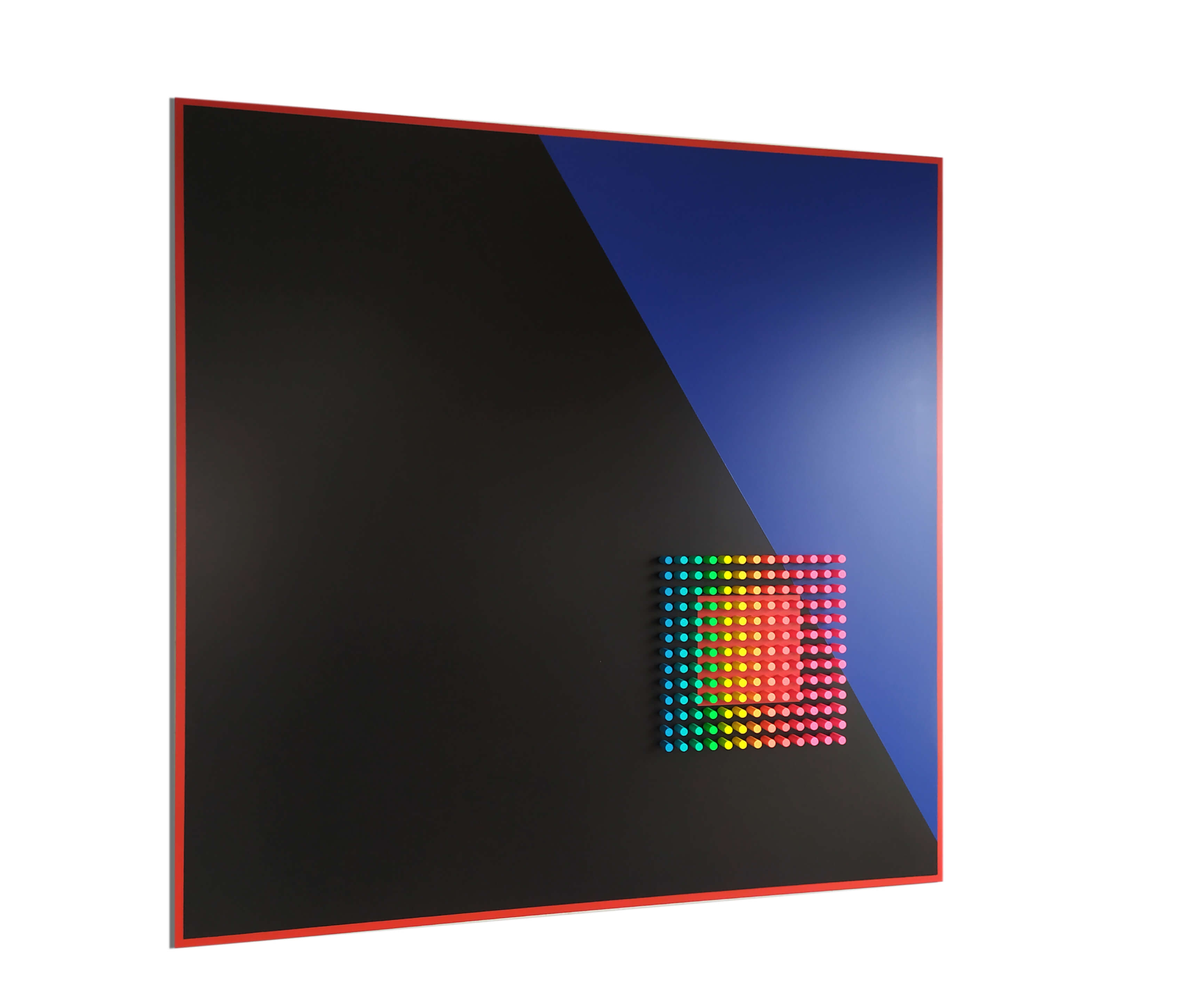"Critical"is part of the Color Objects series, where color becomes an independent sculptural entity. Through pure geometric structure and clean chromatic fields, the work explores how color can exist as an object in itself — tangible, spatial, and rhythmically defined. The relief highlights the materiality of color and its ability to shape perception without narrative.