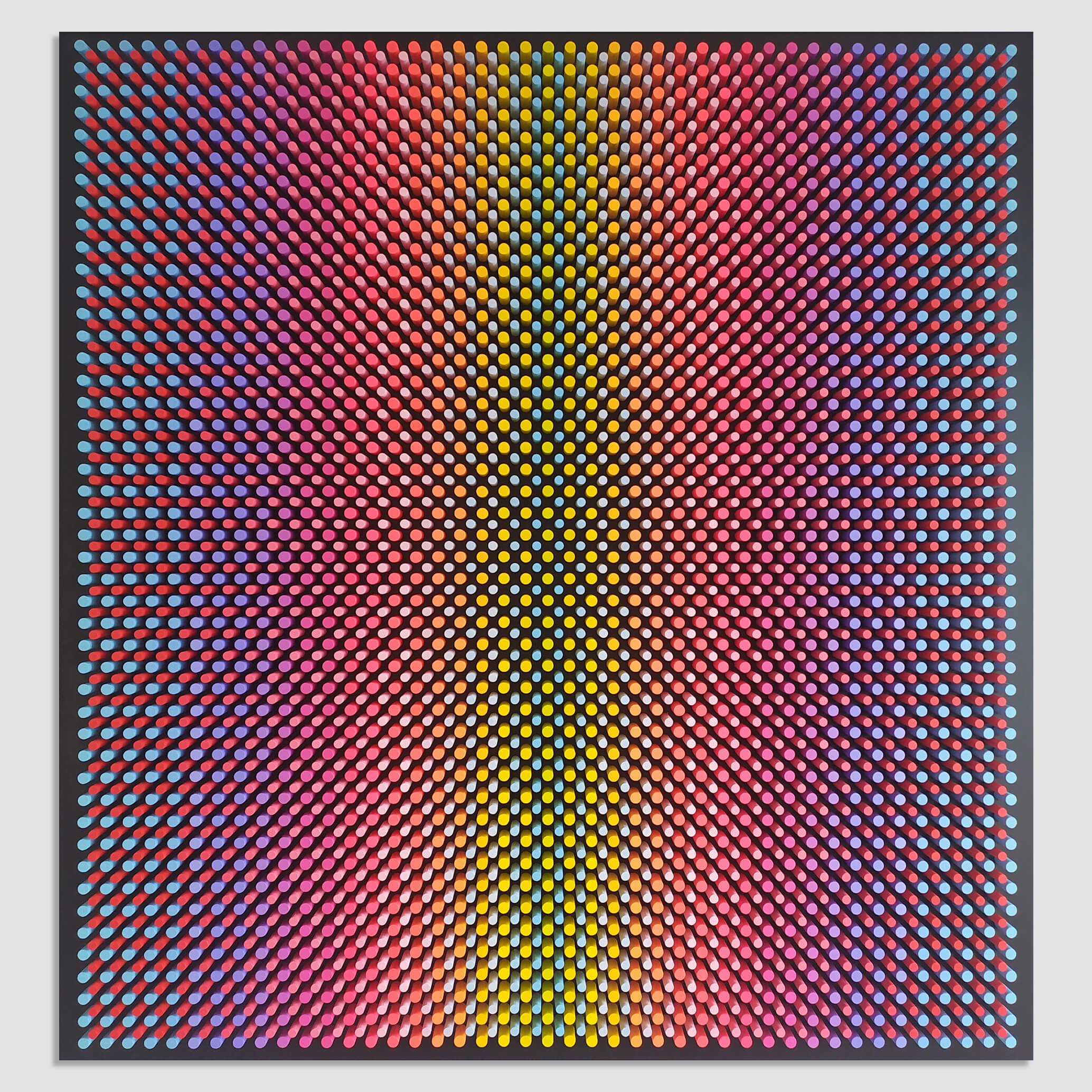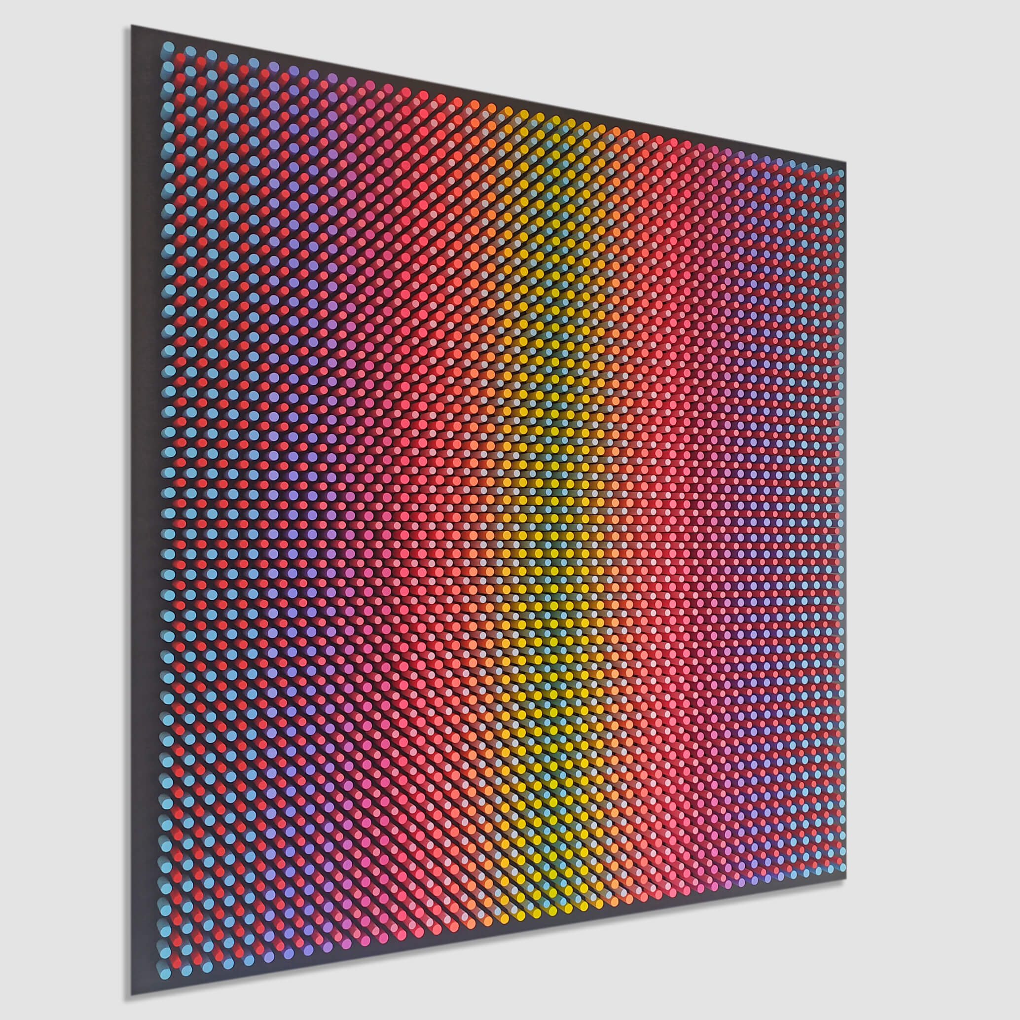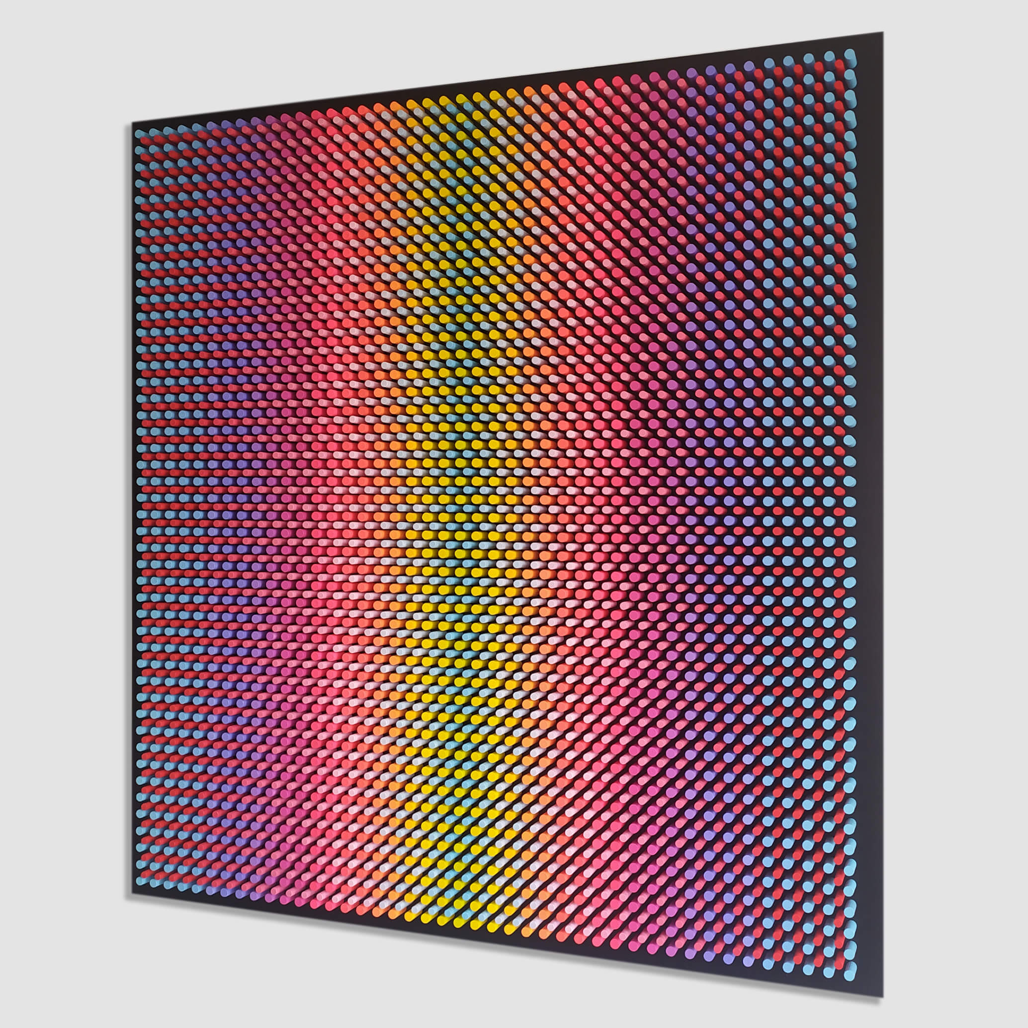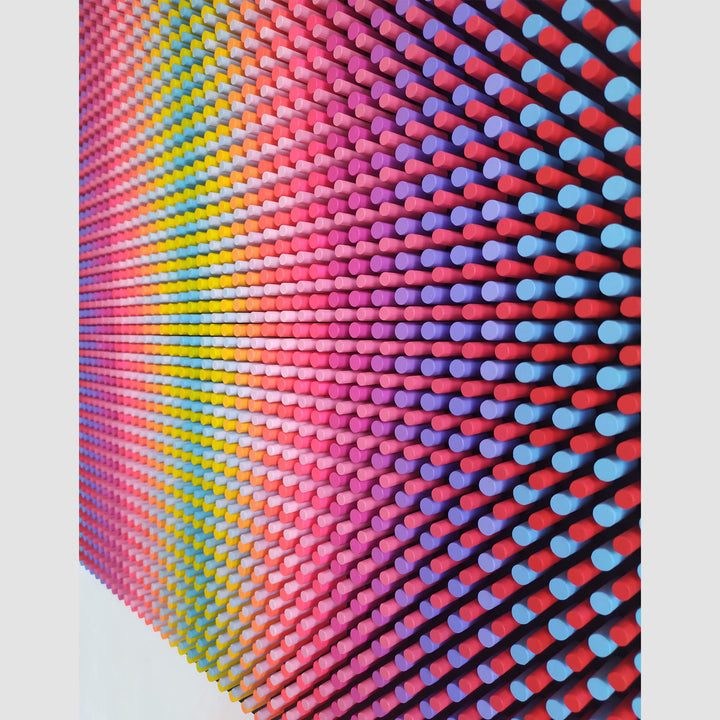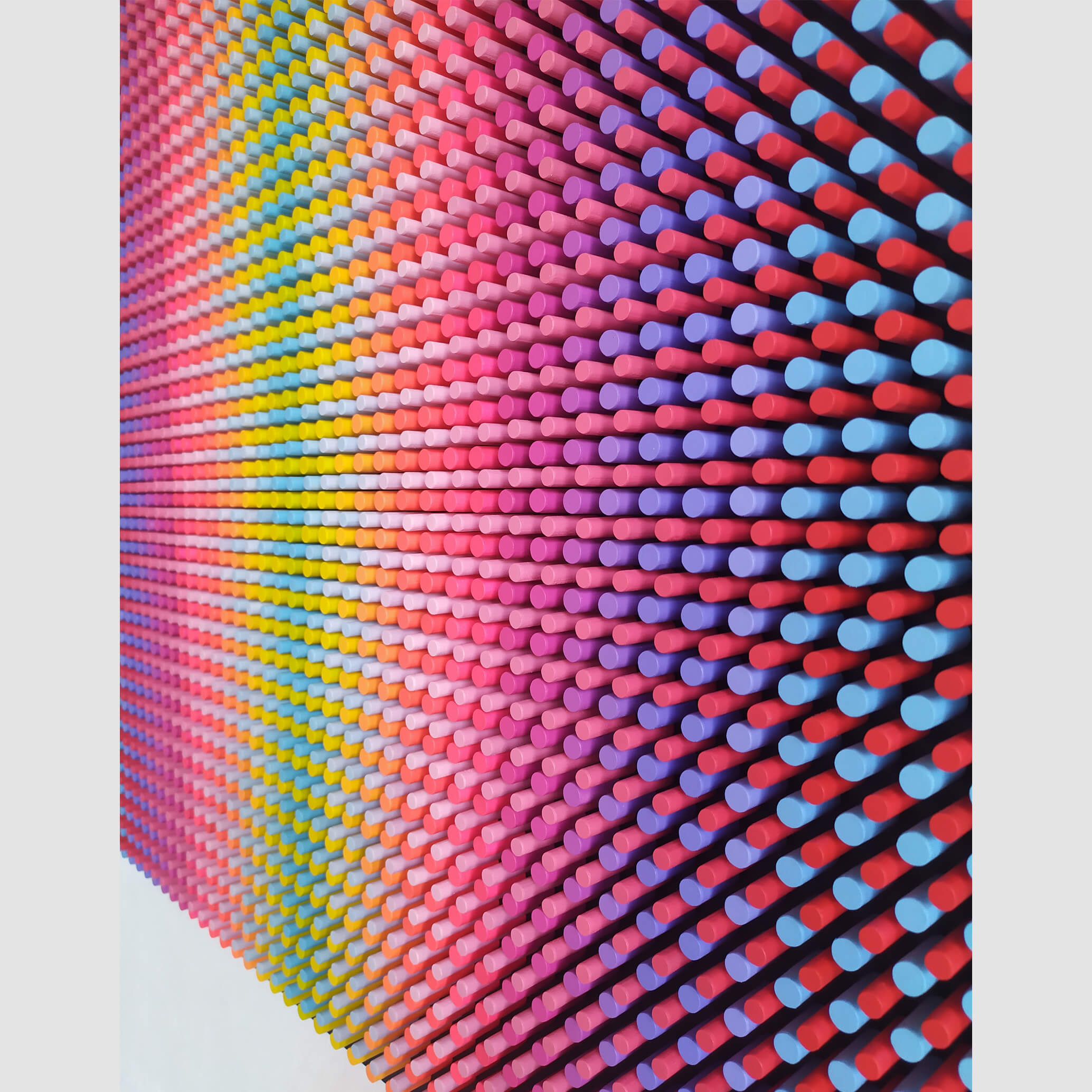 "Flowers " is part of the Vibration series, where rhythmic wooden structures generate a pulsating visual field. Through dense repetition, shifting color, and precise geometric intervals, the work creates the sensation of vibration — a subtle oscillation between tension and release. The relief captures how micro-movements of form and color can activate space and influence perception.