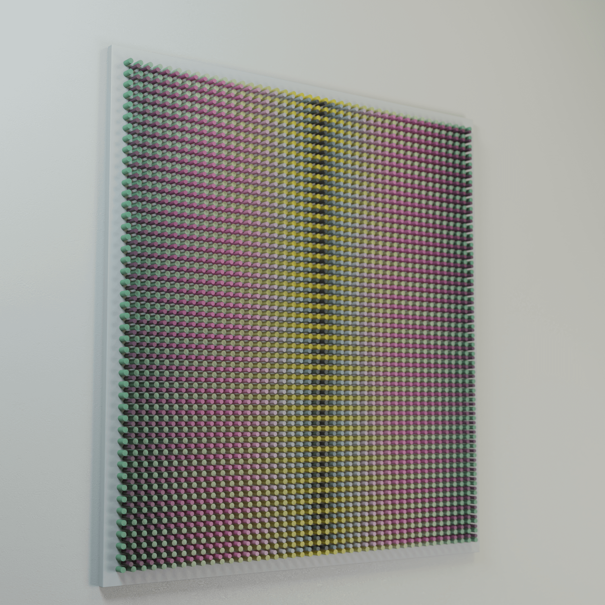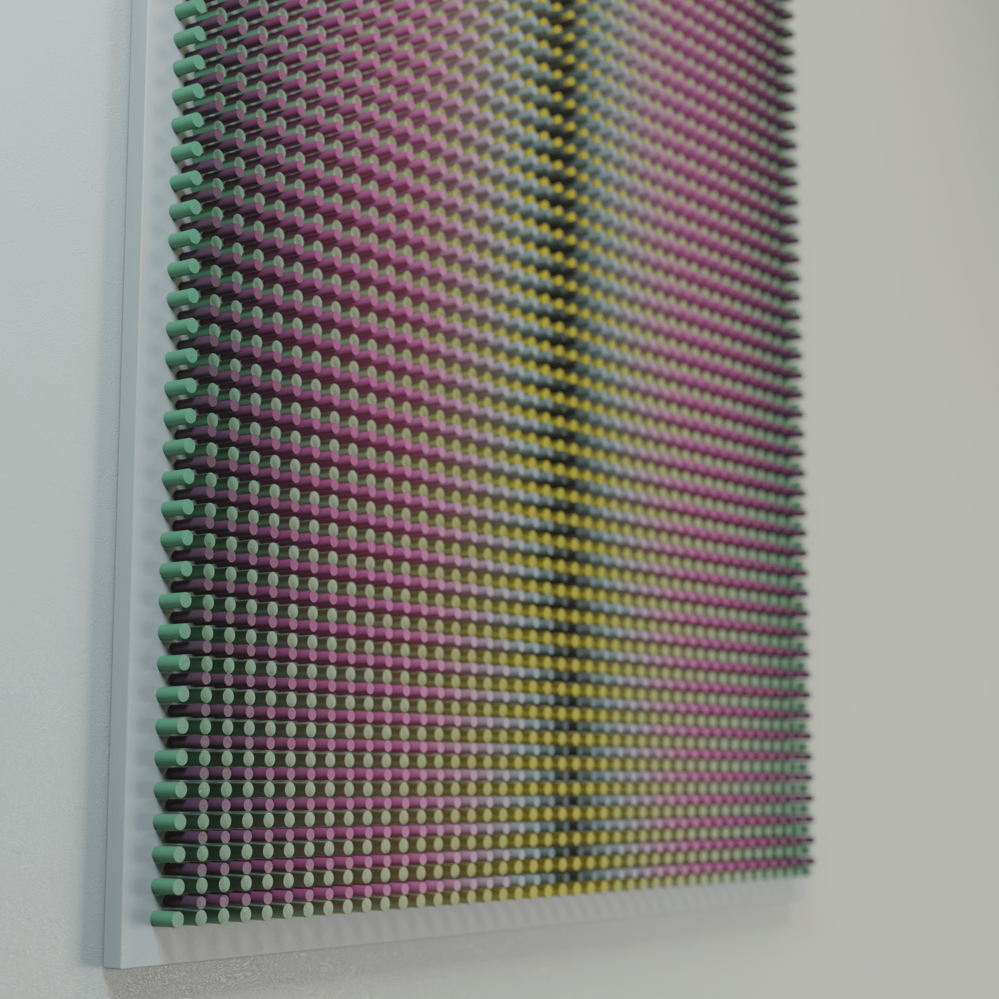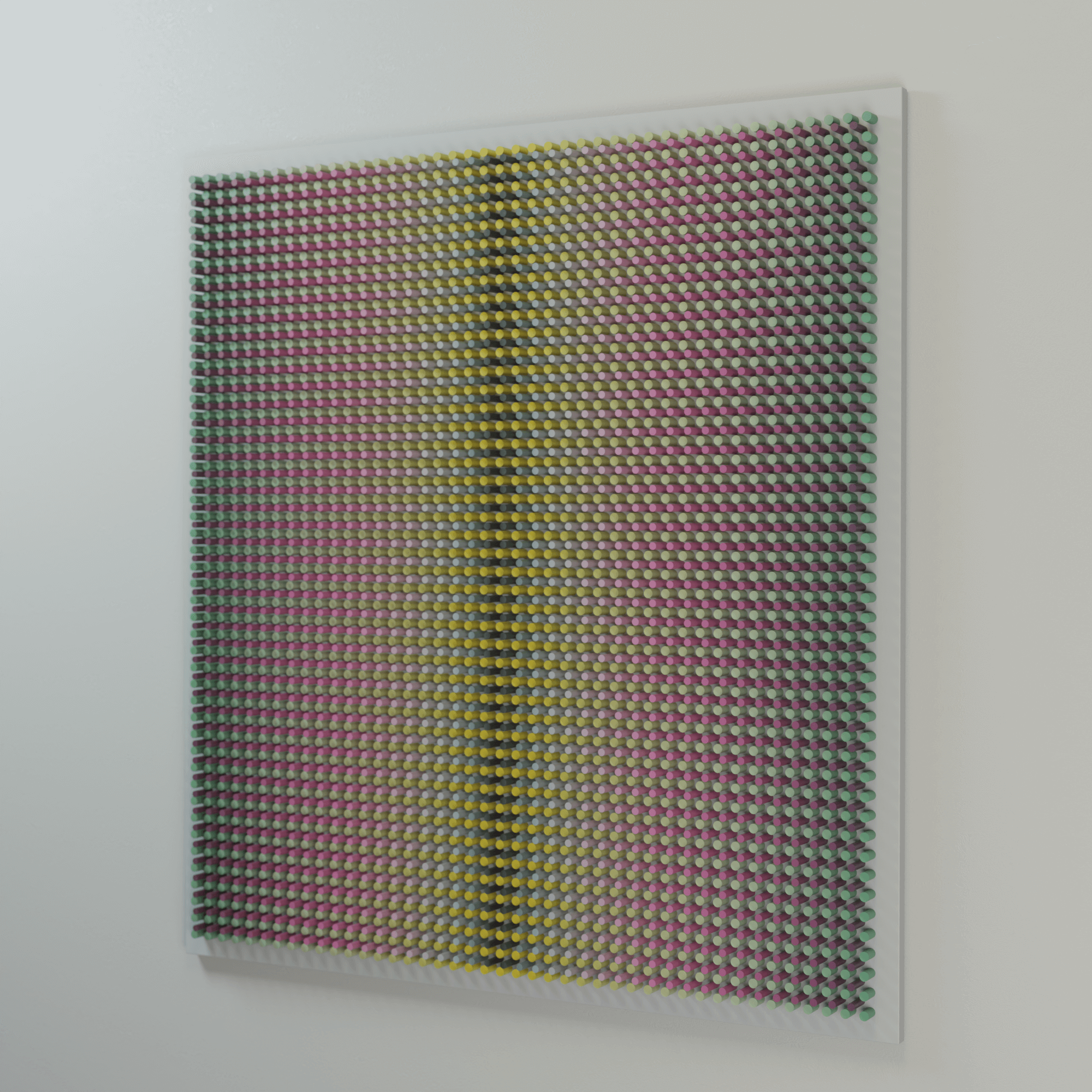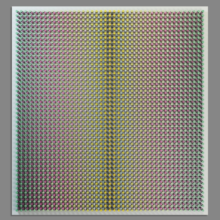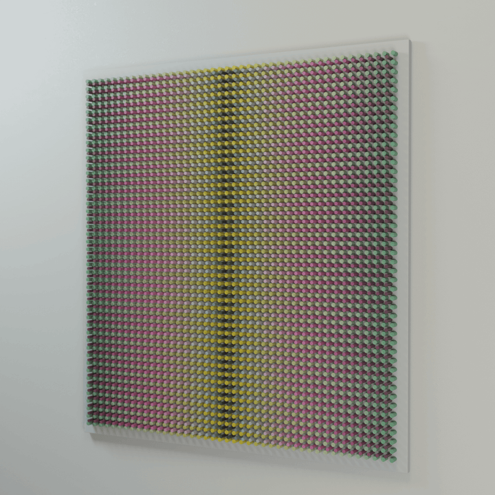 "Flowers 2" is part of the Vibration series, where rhythmic wooden structures generate a pulsating visual field. Through dense repetition, shifting color, and precise geometric intervals, the work creates the sensation of vibration — a subtle oscillation between tension and release. The relief captures how micro-movements of form and color can activate space and influence perception.