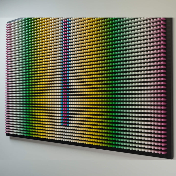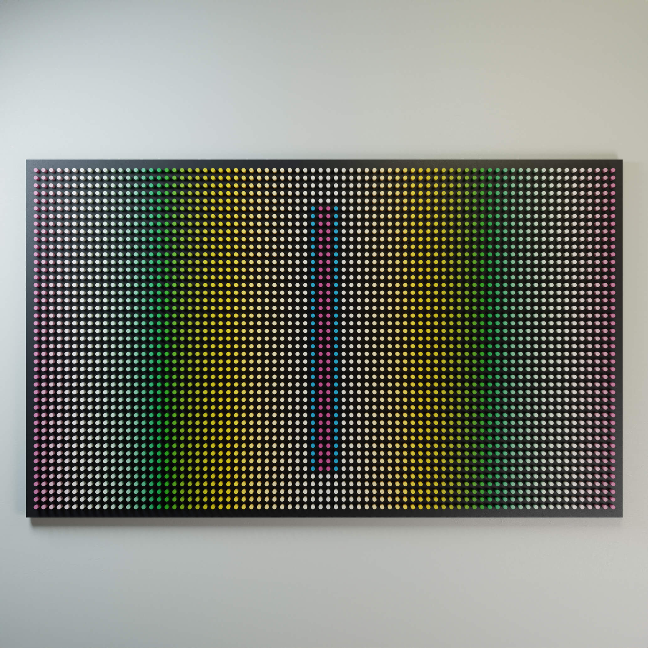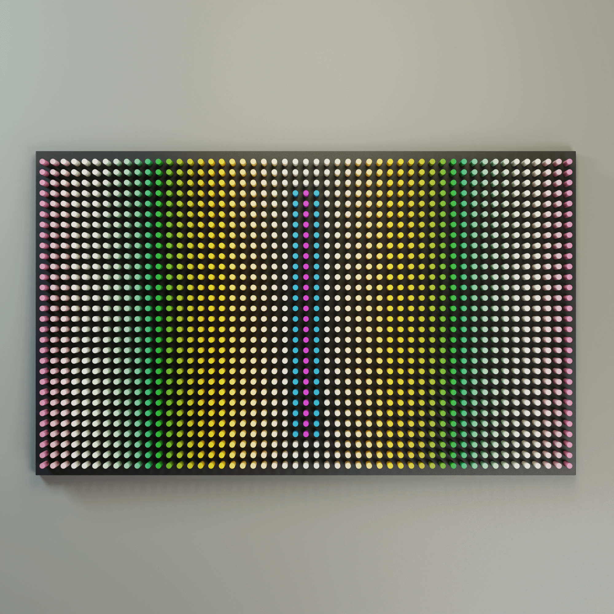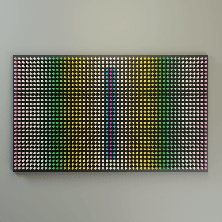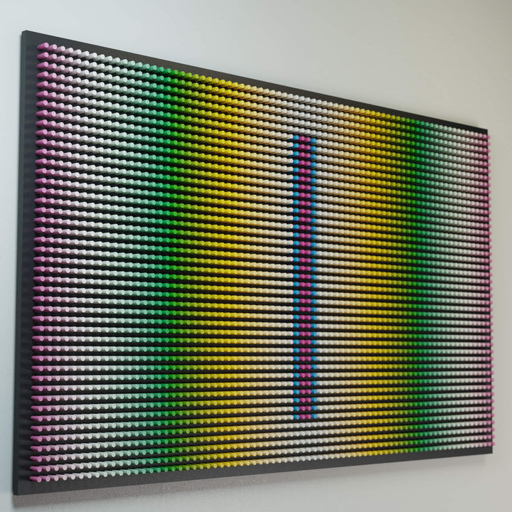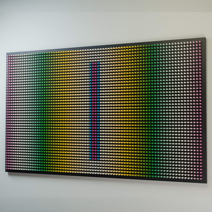 "Flowers Screen" is part of the Screens series, where layered wooden structures resemble abstract interfaces — windows into shifting emotional and perceptual states. The work explores how color, rhythm, and geometric segmentation can create the feeling of looking through a digital screen into a deeper, quieter inner landscape.
