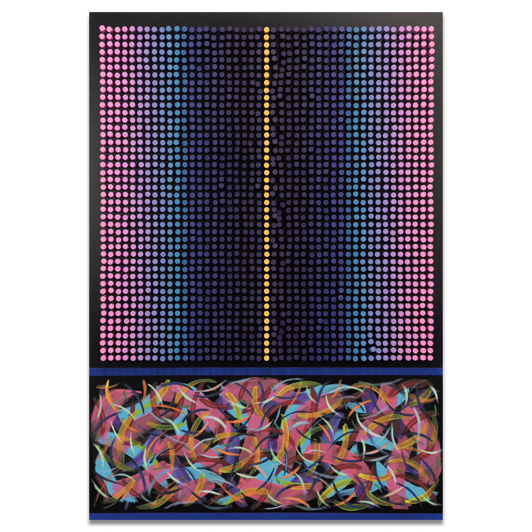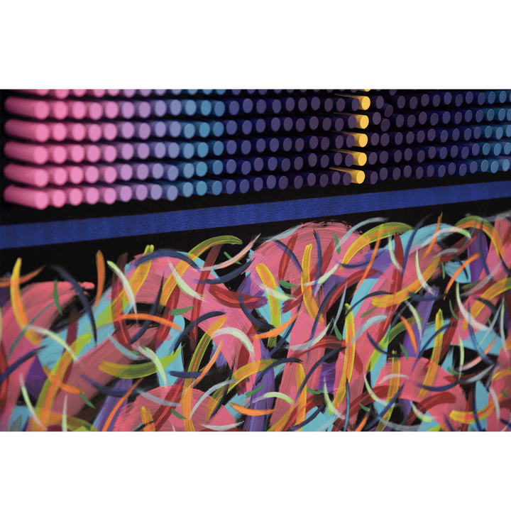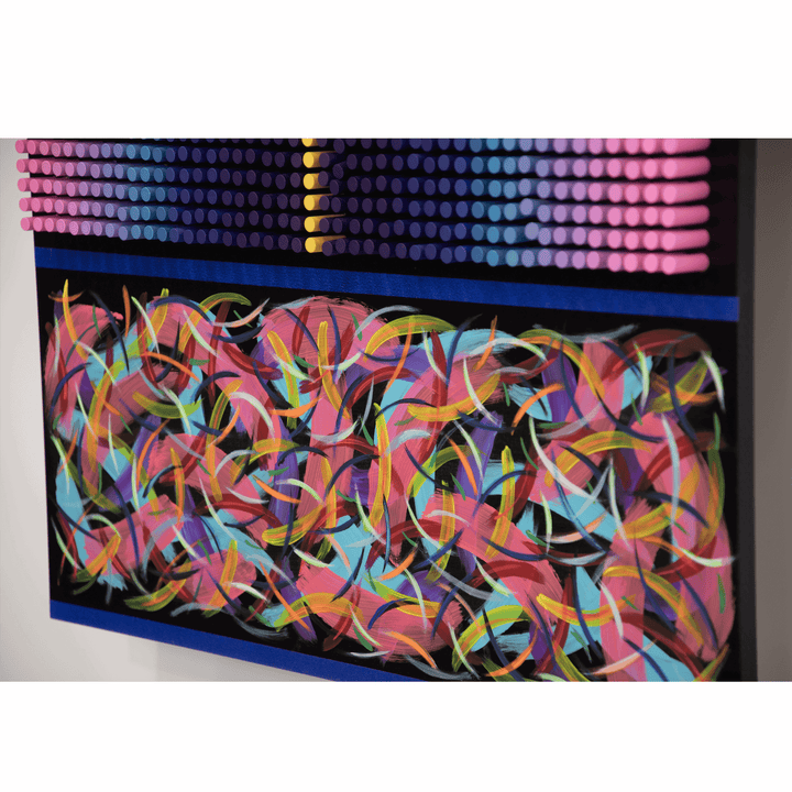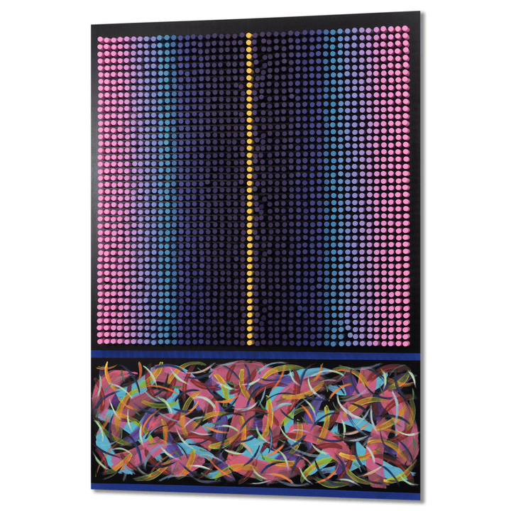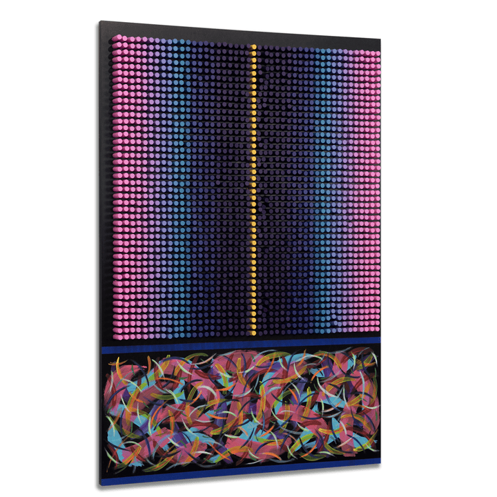 A vertical relief exploring the quiet intensity of night. Gradients of deep blue pulse through a field of wooden elements, creating a sense of depth, stillness, and slow movement. The lower section introduces a contrasting symbolic landscape — a horizon line where geometry, color, and emotion meet.