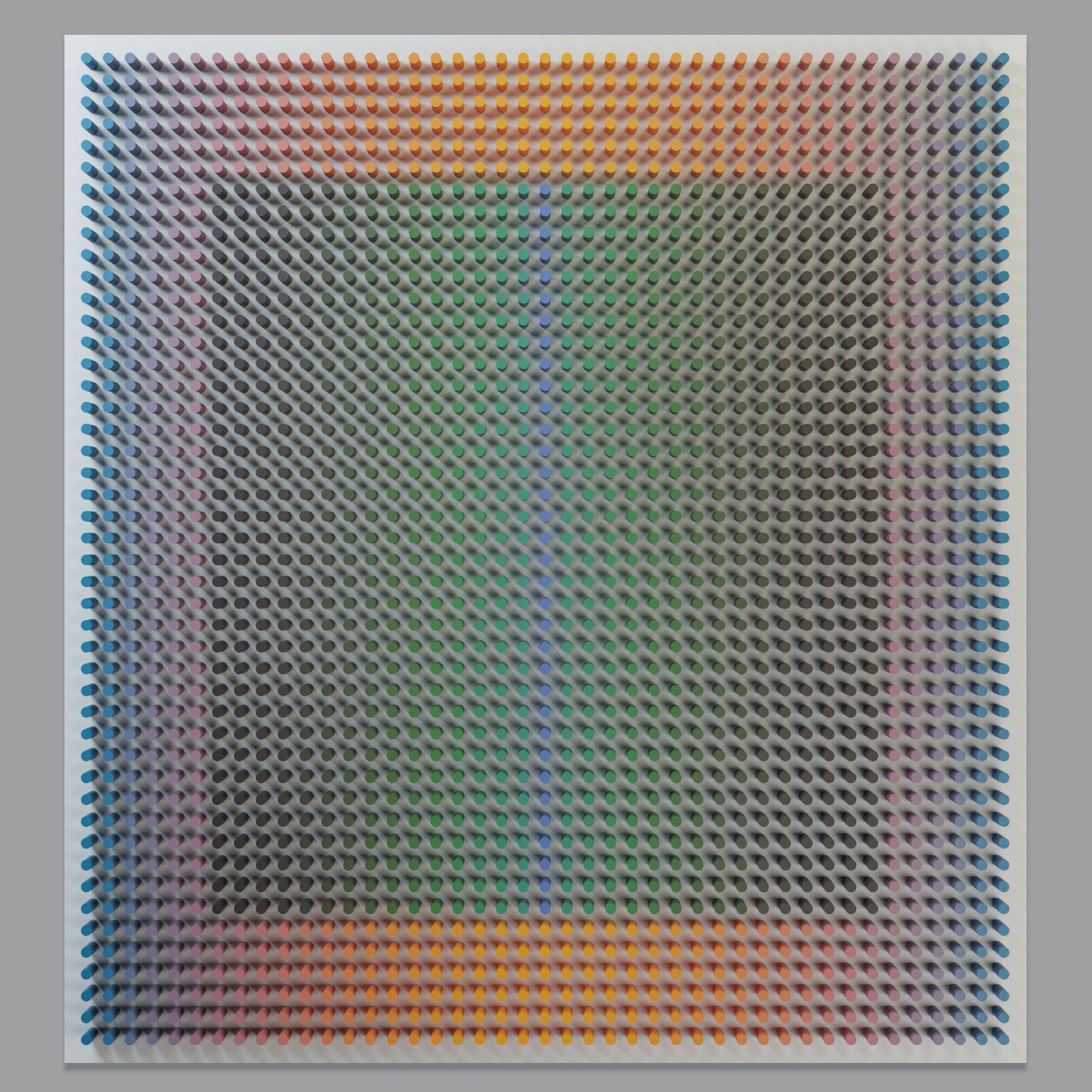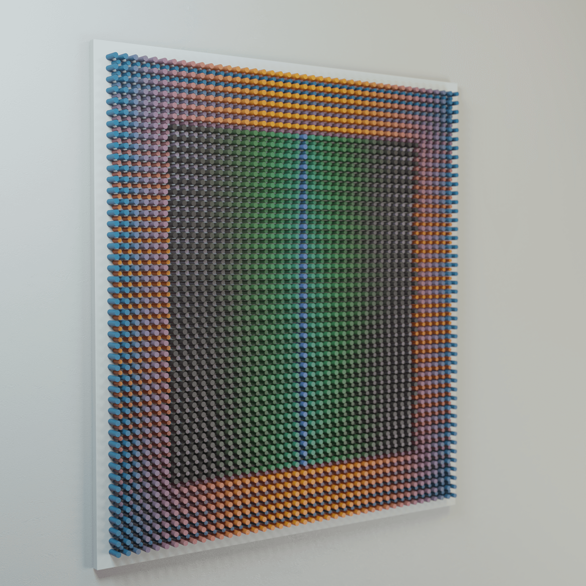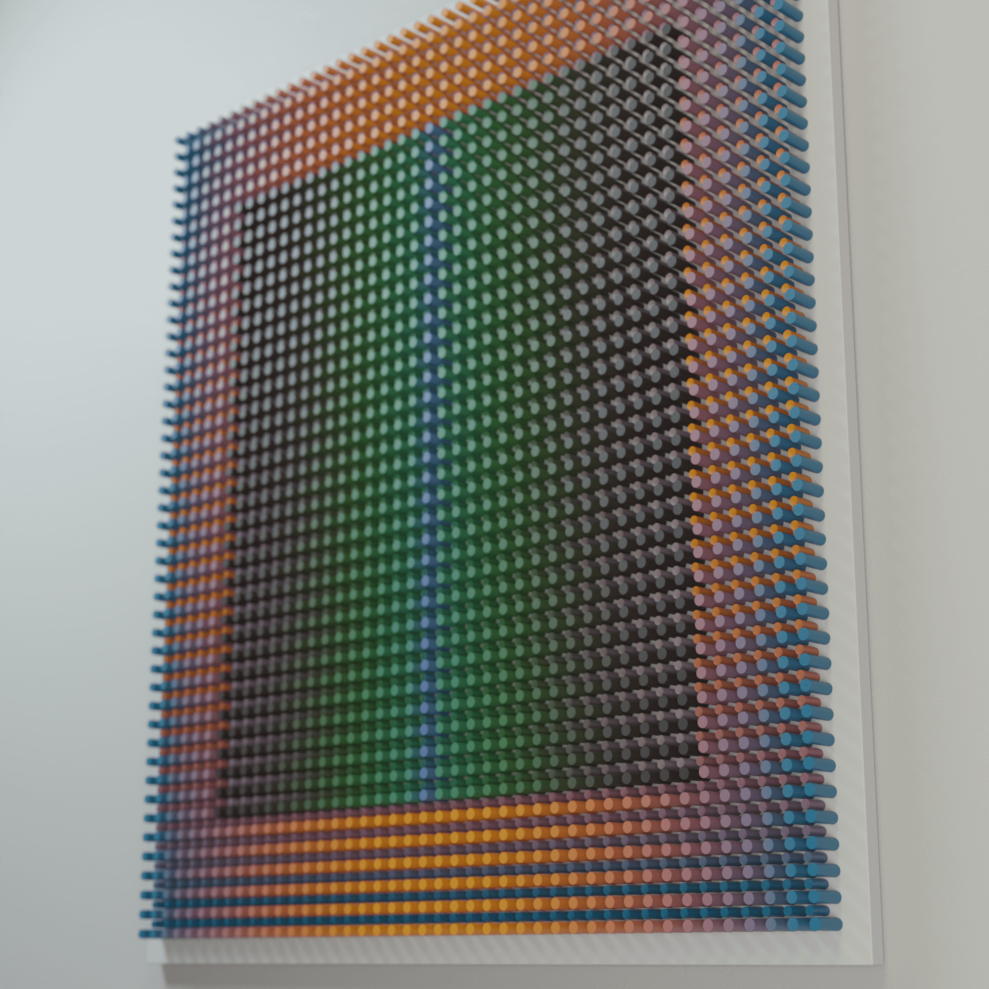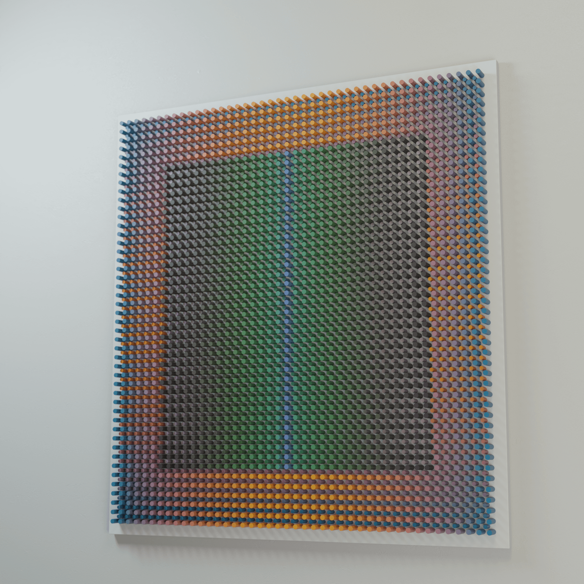 "Warm around" is part of the Vibration series, where rhythmic wooden structures generate a pulsating visual field. Through dense repetition, shifting color, and precise geometric intervals, the work creates the sensation of vibration — a subtle oscillation between tension and release. The relief captures how micro-movements of form and color can activate space and influence perception.