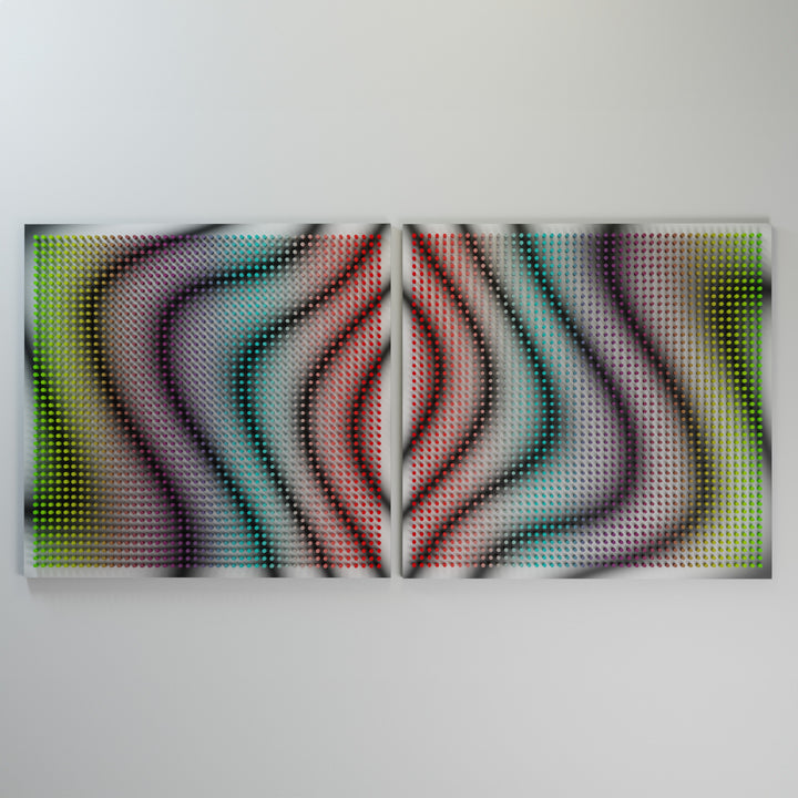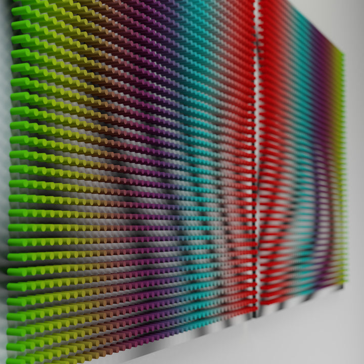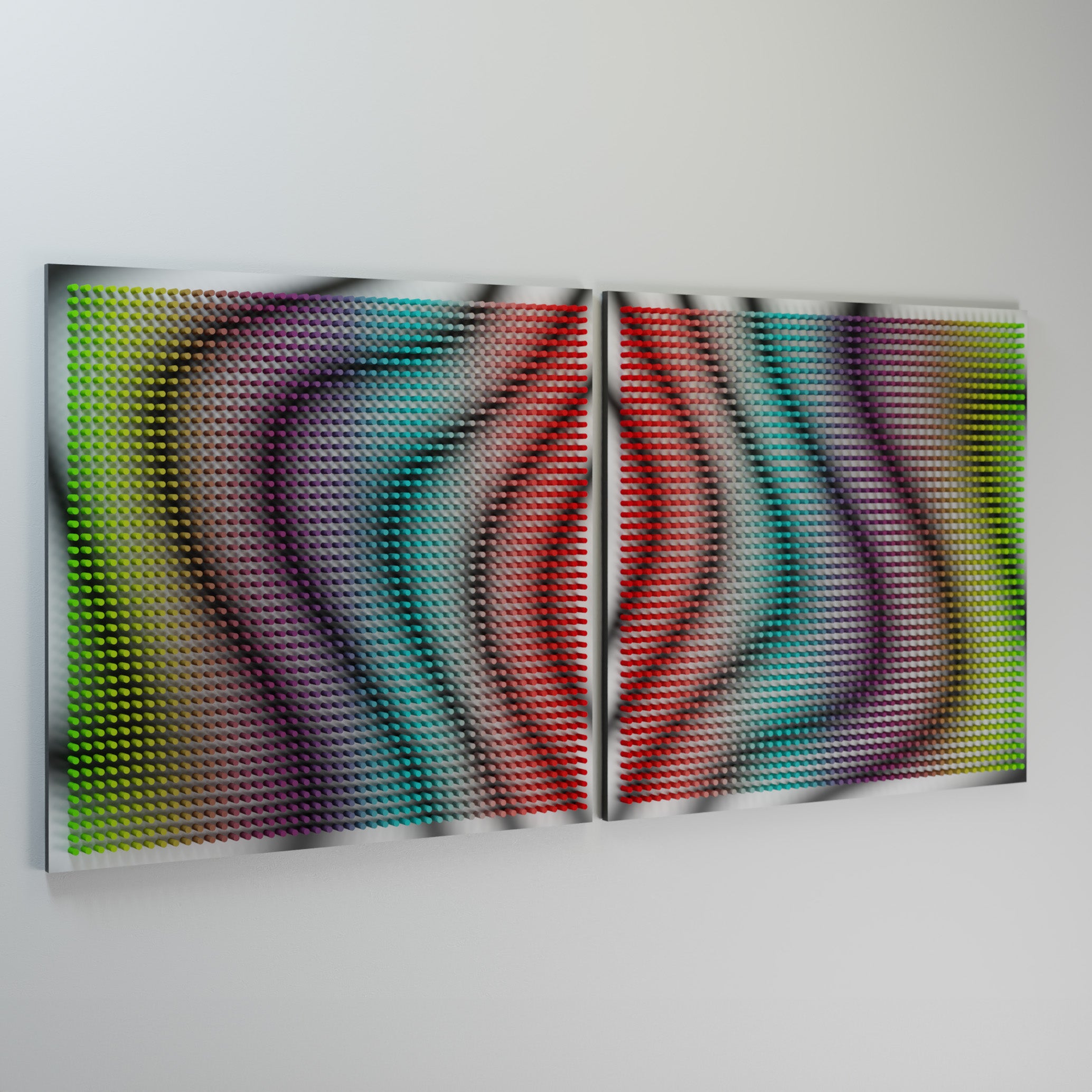 “Waves 5.0” belongs to the Waves series, where flowing wooden structures and shifting color gradients create the sensation of movement, breath, and natural rhythm. The work captures the pulse of energy traveling through space.